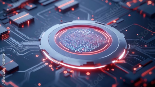 A glowing hologram rests on a detailed digital circuit board, surrounded by intricate tech patterns and bright lights, showcasing stunning hyperrealism