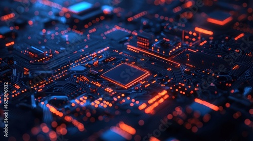 A glowing, intricate circuit board with a central processor chip, surrounded by numerous electronic components and glowing red and blue lights.