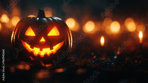 A glowing jack-o'-lantern illuminated by candlelight, embodying the spirit of Halloween in a dark, mysterious setting.