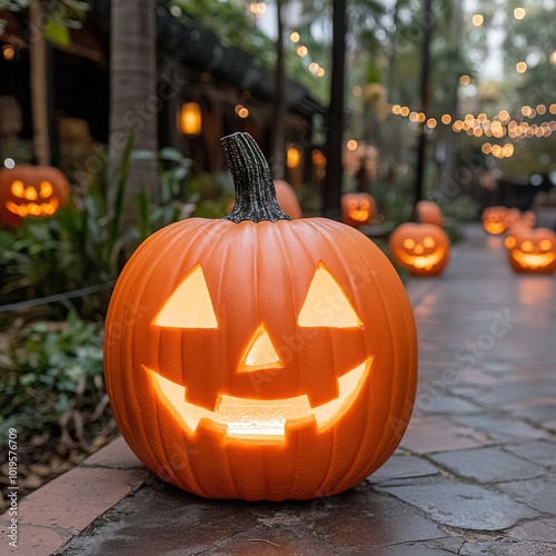 pumpkin, halloween, decoration, light, smile, autumn, festival, skittish, pathway, lantern, orange, night, celebration, ambience, joy, tradition, carving, tree, nature, scene, festive, glow, cheerful, design, seasonal, fun, community, family, gathering, event, eerie, atmosphere, creativity, artistry, culture, harvest, fright, playful, whimsical, evening, festivity, light, mood