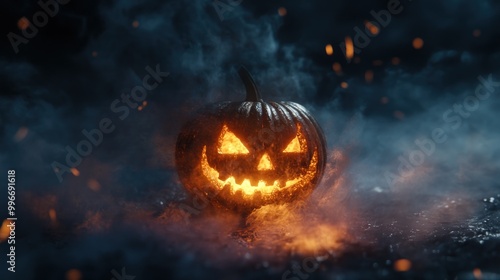 A glowing jack-o'-lantern surrounded by mist, evoking a spooky Halloween atmosphere.