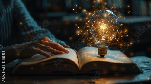 A glowing light bulb emerges from an open book, symbolizing the power of knowledge and inspiration.