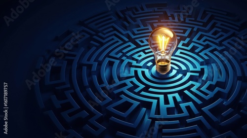 A glowing light bulb shines within the intricate interconnected pathways of a complex maze