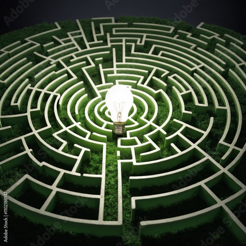 A glowing lightbulb sits at the center of a sprawling, green maze,