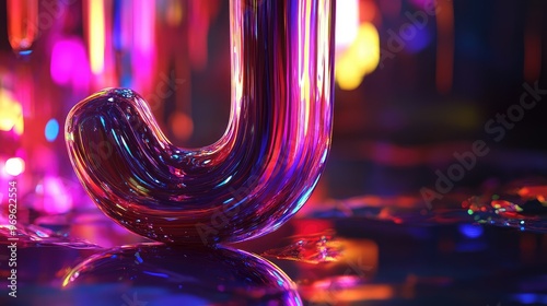 A glowing, liquid-like "J" abstractly dripping into an invisible pool, with colorful lights reflecting off its glossy surface. Fluid and reflective