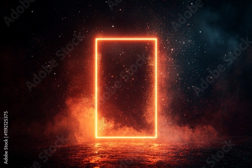 A glowing neon frame suspended in a dark void, surrounded by faint holographic particles shimmering in the light