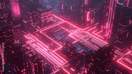 A glowing pink digital city grid with intricate connections, symbolizing futuristic urban data systems.