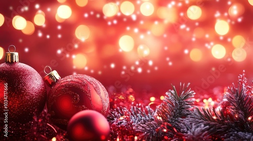 A glowing red Christmas background with sparkling lights, shimmering snowflakes, and festive holiday decorations.
