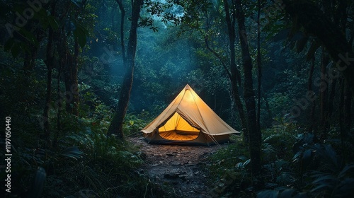 A glowing tent nestled in a misty forest at dusk, surrounded by towering trees and a tranquil twilight atmosphere, symbolizing adventure and solitude. Perfect for camping and wilderness themes.