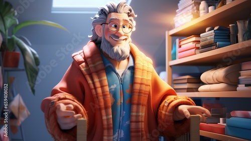 A god or grandfather with a white beard sits on a sofa holding a book in a private library, generative ai