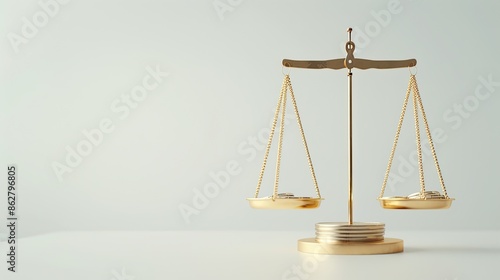 A gold balance scale with coins on each side rests on a white surface, showcasing a concept of balance and equality