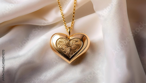 a gold heart pendant necklace on a delicate chain, gracefully displayed on soft white fabric. The interplay of gold and fabric should create a sense of softness and warmth, ideal for a romantic and so