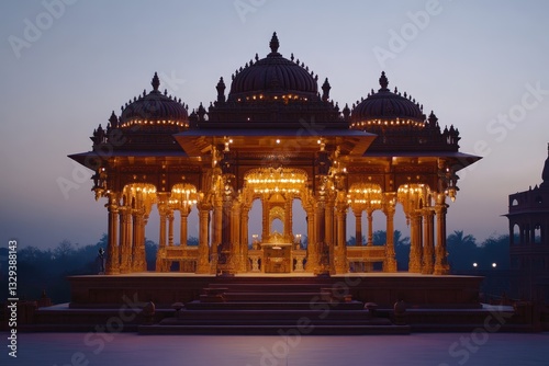 architecture, structure, building, gold, illumination, light, evening, dusk, pillar, column, dome, dome, elaborate, ornate, detailed, design, carving, step, platform, complex, symmetric, facades, religious, culture, traditional, artistry, craftsmanship, sanctuary, temple, historical building, exterior, scenic, background, landscape, tree, plant, sky, twilight, glow, shadow, surface, level, composition, front view, illuminated