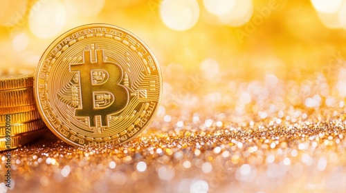 A golden bitcoin coin is prominently displayed against a glittering background, symbolizing wealth and digital currency innovation