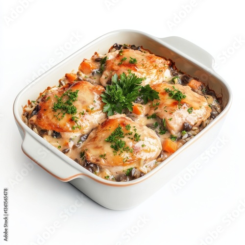A golden brown chicken and rice casserole in a rustic baking dish, garnished with fresh herbs and ready to serve.