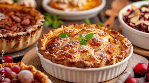 A golden brown pie takes center stage among an array of nut and fruit pies. The flaky crust and decorative top add a touch of rustic charm to this delicious spread.
