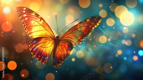 butterfly, wing, gold, bokeh, light, blur, abstract, nature, insect, flight, flying, colours, orange, yellow, red, blue, green, macro, closeup, pattern, texture, art, design, background, beautiful, delicate, fragile, sparkle, shine, glow, soft, dreamy, magical, fantasy, hope, freedom, transformation, life, inspiration