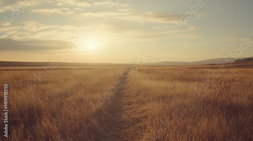 field, grass, path, sun, sky, horizon, sunset, dawn, dusk, light, yellow, gold, rural, landscape, nature, outdoors, scenic, calm, tranquil, serene, warm, meadow, dry, tall, plant, vegetation, earth, wilderness, distance, expansive, huge, open, space, simple, beautiful, peaceful, atmosphere, ray, cloudy, orange, tone, travel, journey, country, trail, dirt, passage