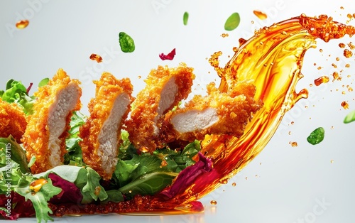 A golden honey-mustard wave swirling through crispy chicken tenders and fresh salad greens, placed on a white background with soft lighting