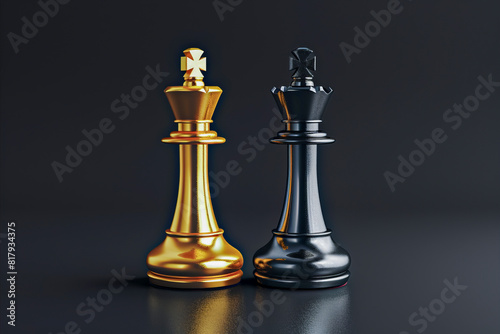a golden king and a black king chess piece on a dark surface with dramatic lighting