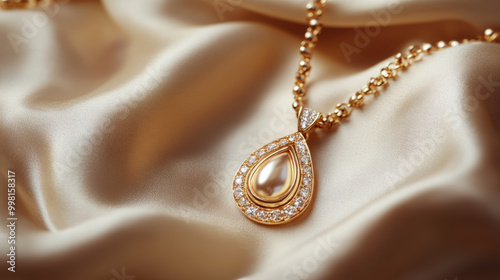 A golden necklace with a pendant displayed on a luxurious silk background.