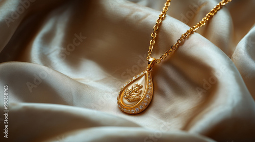 A golden necklace with a pendant displayed on a luxurious silk background.