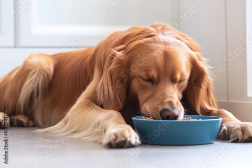 dog, golden retriever, retriever, canino, pet, animal, puppy, dog food, bowl, eating, ravenous, food, kitchen, tile, floor, kibble, adorable, cute, domestic, furry, friends, loyal, companion, playful, happy, vet, gold, brown, white, fur, paw, eye, nose, mouth, tongue, sweet