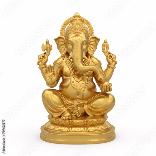 ganesh, statue, figurine, sculpture, idol, religion, religious, spiritual, mythology, symbol, devotion, prosperity, success, wisdom, good luck, wealth, metallic, shiny, gilded, glossy, white background, isolated, studio shot, object, traditional, culture, abstract, meditation