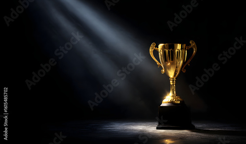 A golden trophy shines in a dramatic spotlight on a dark background, highlighting a shiny metallic surface and an elegant design symbolizing achievement and victory