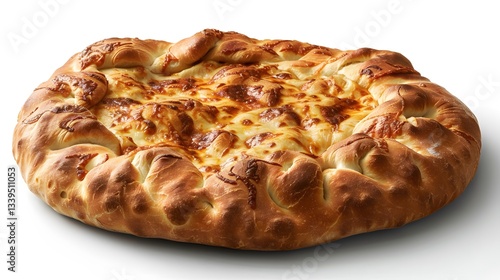 A golden-brown calzone, freshly baked, with a crispy, bubbly crust, isolated on a white background.