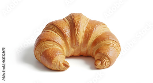 A golden-brown, freshly baked croissant sits on a white surface, casting a soft shadow.