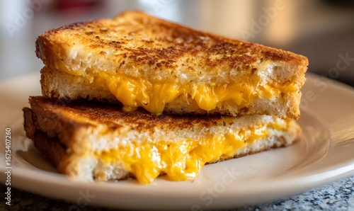 a golden-brown grilled cheese sandwich, sliced in half and stacked