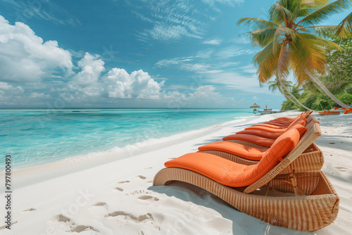 A gorgeous tropical beach resort with a swimming pool and sun loungers on a white sandy beach. Blue sky and palm trees Beautiful scenery of a luxurious summer vacation.