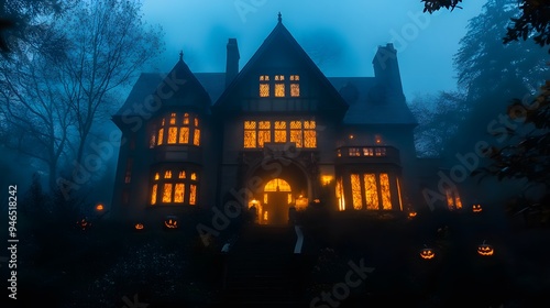 A gothic mansion with high contrast lighting glowing windows and elaborate Halloween decorations surrounded by a misty atmosphere