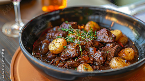 A gourmet beef stew with potatoes and herbs, served in a black bowl, ideal for food blogs, culinary magazines, and meal preparation visuals,