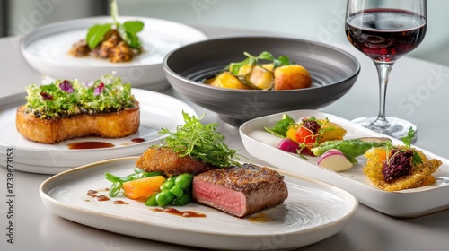 A gourmet dining arrangement featuring beautifully plated dishes, including steak, greens, and a glass of red wine, showcasing modern culinary art.