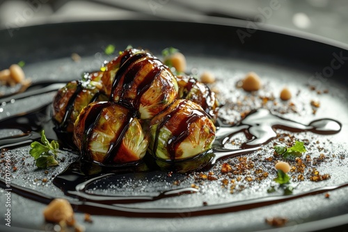 A gourmet dish featuring Brussels sprouts drizzled with a rich balsamic glaze and sprinkled with herbs.