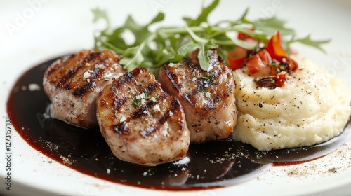A gourmet dish featuring grilled meat, mashed potatoes, and fresh greens, elegantly plated.