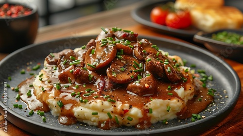 epicure, beef, tender, mushroom, sour, cream, sauce, mashed, potato, chives, dark, slate, plate, high-end, eatery, kitchen, softly, blurred, background, vibrant, colours, realistic, texture, detailed, presentation, culinary, photo, depth, of, field, hd, quality, natural, look