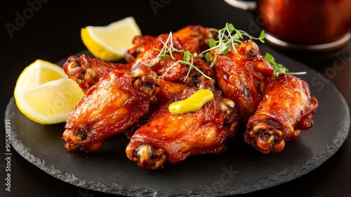 A gourmet serving of hot wings with a tangy mustard sauce, arranged artistically on a slate plate with microgreens and lemon wedges, ultra HD,