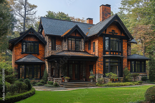 house, home, brick, stone, autumn, tree, leaf, fall, grand, large, luxury home, luxury, elegant, sophisticated, architecture, design, style, window, black, dark, roof, chimney, porch, step, landscaping, garden, plant, shrub, bush, grass, lawn, exterior, facades, residential, property, estate, beautiful, picturesque, charming, inviting, roomy, comfortable, cosy, warm, welcoming