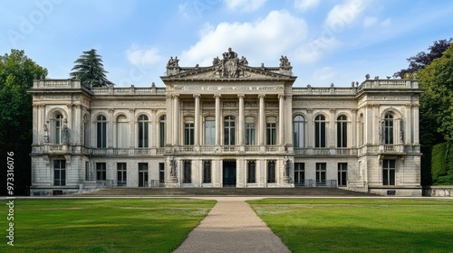 building, architecture, facades, classical, symmetric, entrance, path, lawn, sky, cloud, column, window, door, stone, ornate, grand, majestic, historic, museum, art, culture, history, heritage, travel, destination, landmark, europa, belgium, brussels, royals, palace, park, garden, green, tree, summer, day, sunlight, blue, white, grey, old, traditional, elegant, beautiful, impressive, historical building, structure, design
