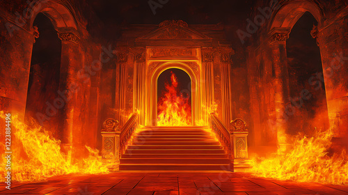 grand, illuminated, throne, room, feature, blazing, fire, highlighting, imposing, staircase, leading, ornate, doorway, cavern, illustration
