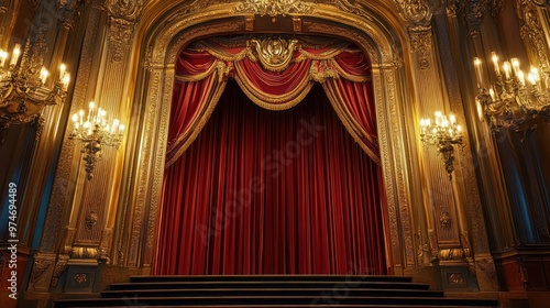 A grand theater stage with rich red curtains and ornate decorations, ready for a performance.