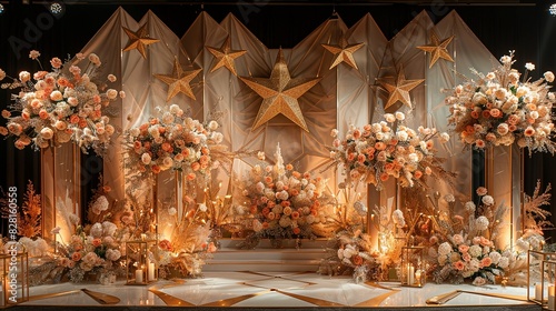 grand, wedding, stage, towering, column, rose, chrysanthemum, large, gold, geometric, star, majestic, opulent, effect