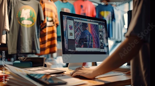 A graphic designer working on T-shirt designs using a computer in a creative workspace, surrounded by printed shirts..