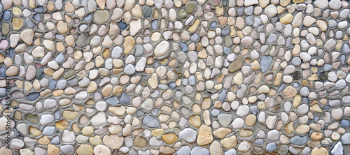 A gray concrete wall made of cement with a lot of sea stones and pebbles of different colors