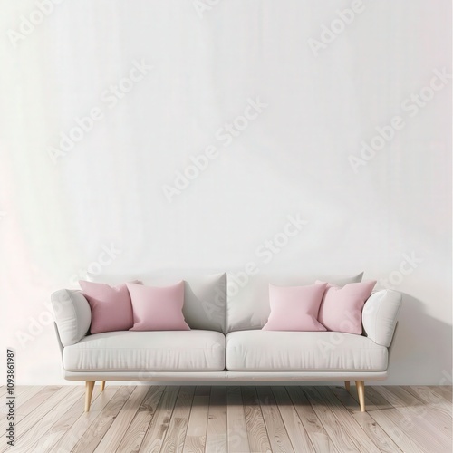 A gray sofa with pink pillows in a minimalist living room with a white wall and wooden floor