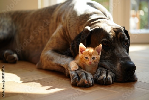dog, kitten, cat, great dane, orange, friendship, pet, domestic, animal, cute, adorable, fur, mammal, lying down, together, companion, love, harmony, peace, calm, cosy, sunlight, light, wooden floor, floor, home, interior, happy, playful, paw, sleeping, resting, closeup, brown, eye, whisker, gentle, care, affection, warm, daylight, portrait, room, beautiful, serene, peaceful, sweet, tender