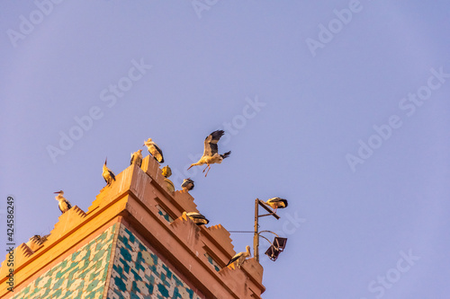 africa, african, arab, arabic, architecture, building, city, culture, destination, destination, famous, heritage, islam, islamic, landmark, market, marrakech, marrakech, medina, minaret, moroccan, morocco, mosque, muslim, old, panoramic, place, religious, sky, square, style, tour tourism, holiday maker, tower, town, traditional, travel, unesco, view, wall, flock, stork, bird, flying, sunset, nest